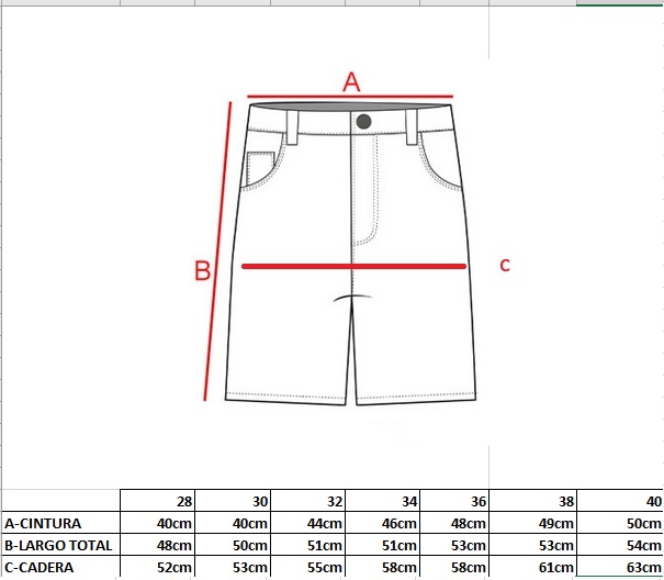 Mira nuestra tabla de medidas que esta a continuacion y comparala con la bermuda que te quede mas comoda! Te recomendamos que para tomar las medidas la apoyes en una mesa.