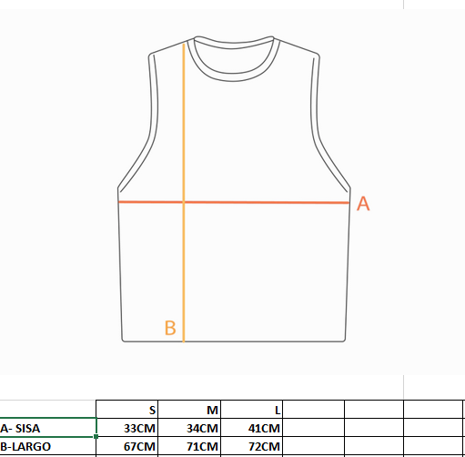 Medida B: Medir desde el borde lateral del cuello hasta abajo de la remera, en linea recta.