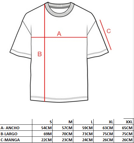 Mira nuestra tabla de medidas que esta a continuacion y comparala con la remera que te quede mas comoda! Te recomendamos que para tomar las medidas la apoyes en una mesa.