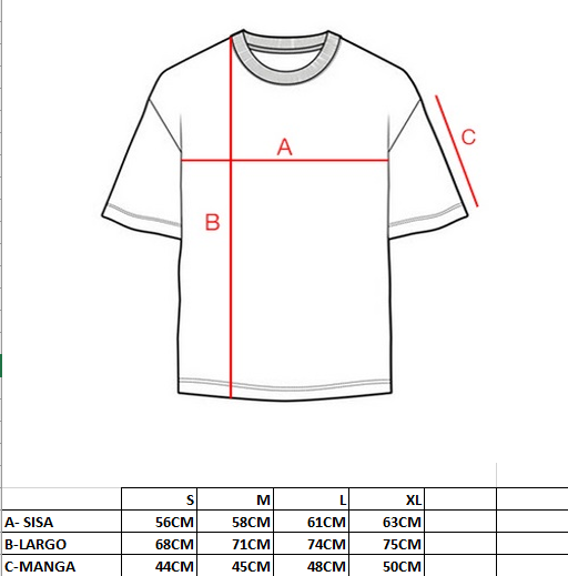Mira nuestra tabla de medidas que esta a continuacion y comparala con la remera que te quede mas comoda! Te recomendamos que para tomar las medidas la apoyes en una mesa.