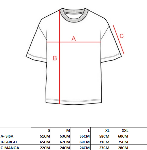 Mira nuestra tabla de medidas que esta a continuacion y comparala con la remera que te quede mas comoda! Te recomendamos que para tomar las medidas la apoyes en una mesa.
